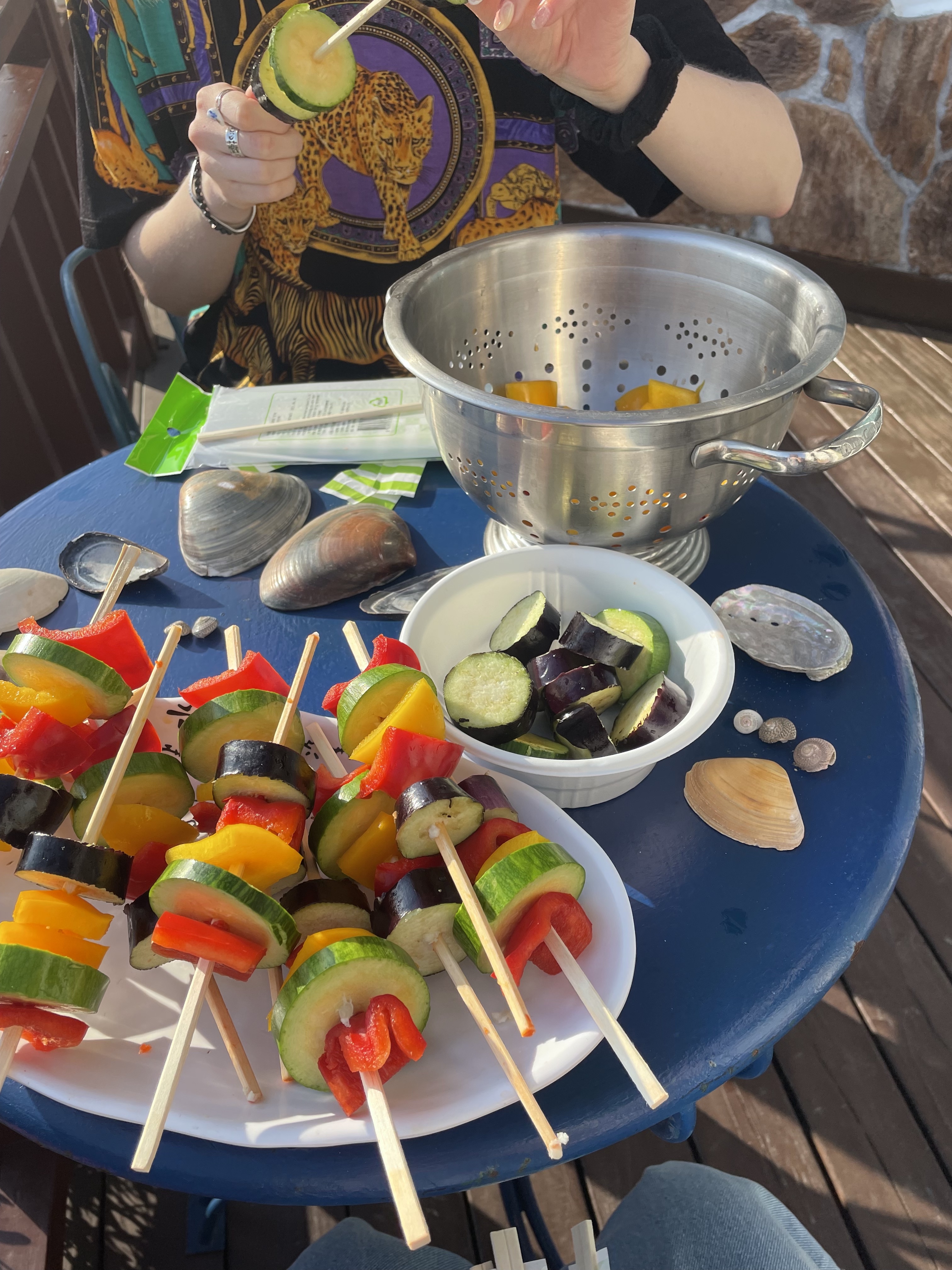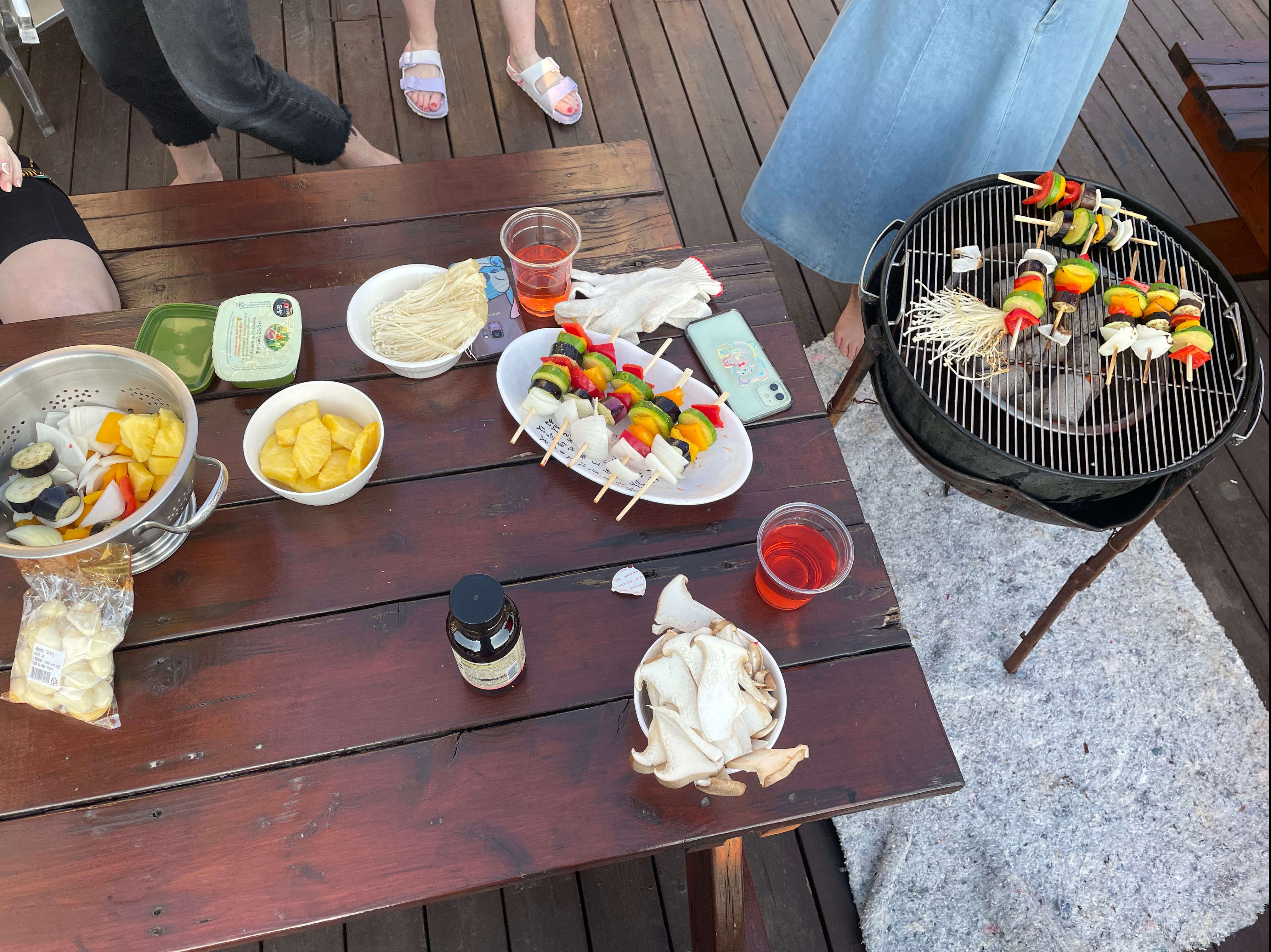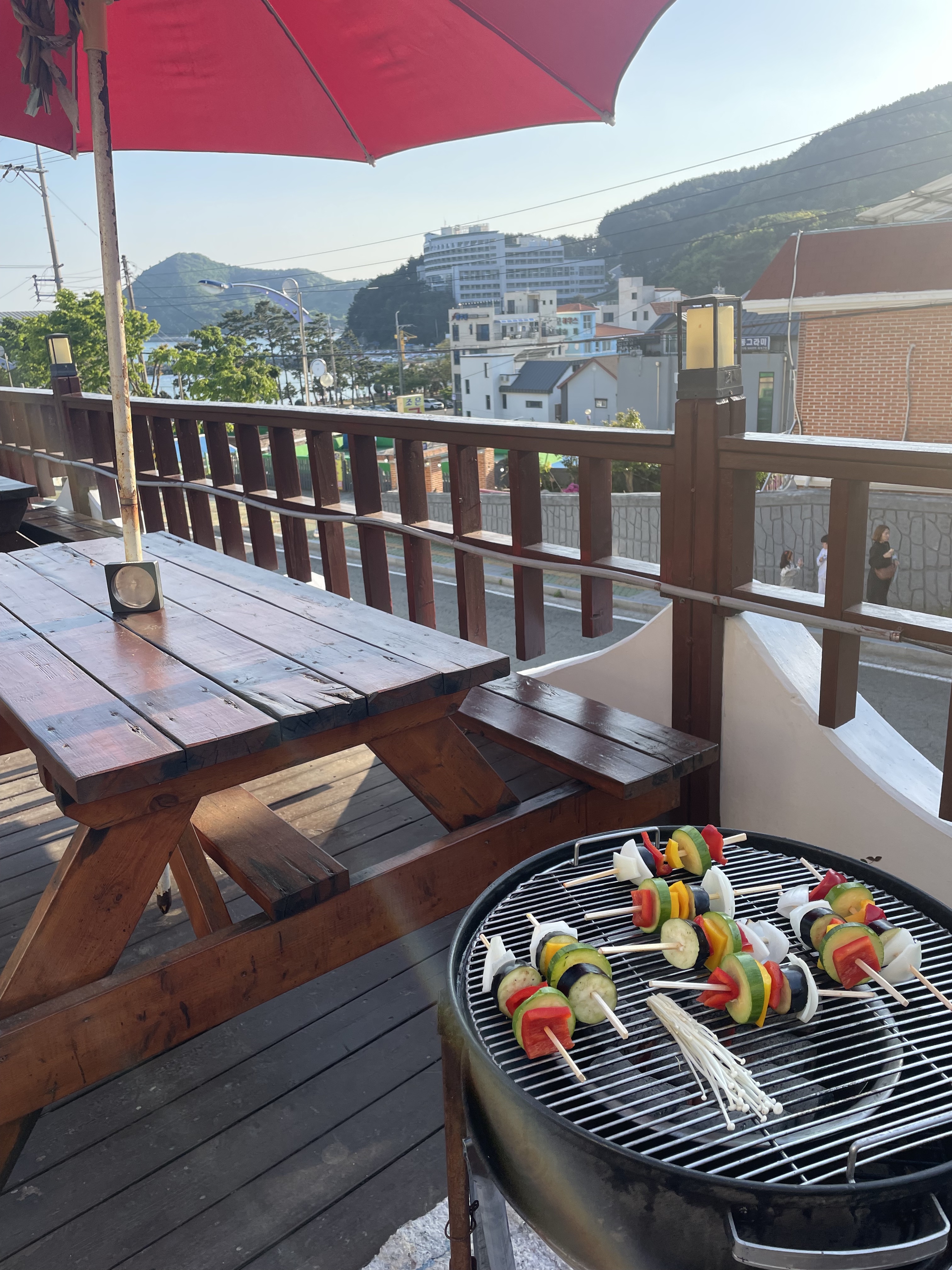 Once we had collected some shells and other random treasures, we headed back to the pension to get started on our barbecue. We had a barbecue outside our room in the garden for an extra fee complete with veggie skewers, meat, and pineapple. By the end, we all felt happily full. Along with some wine concoctions and one more late-night walk along the beach, it was the perfect way to end the first day of our vacation.